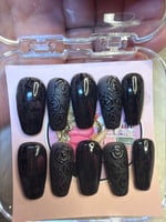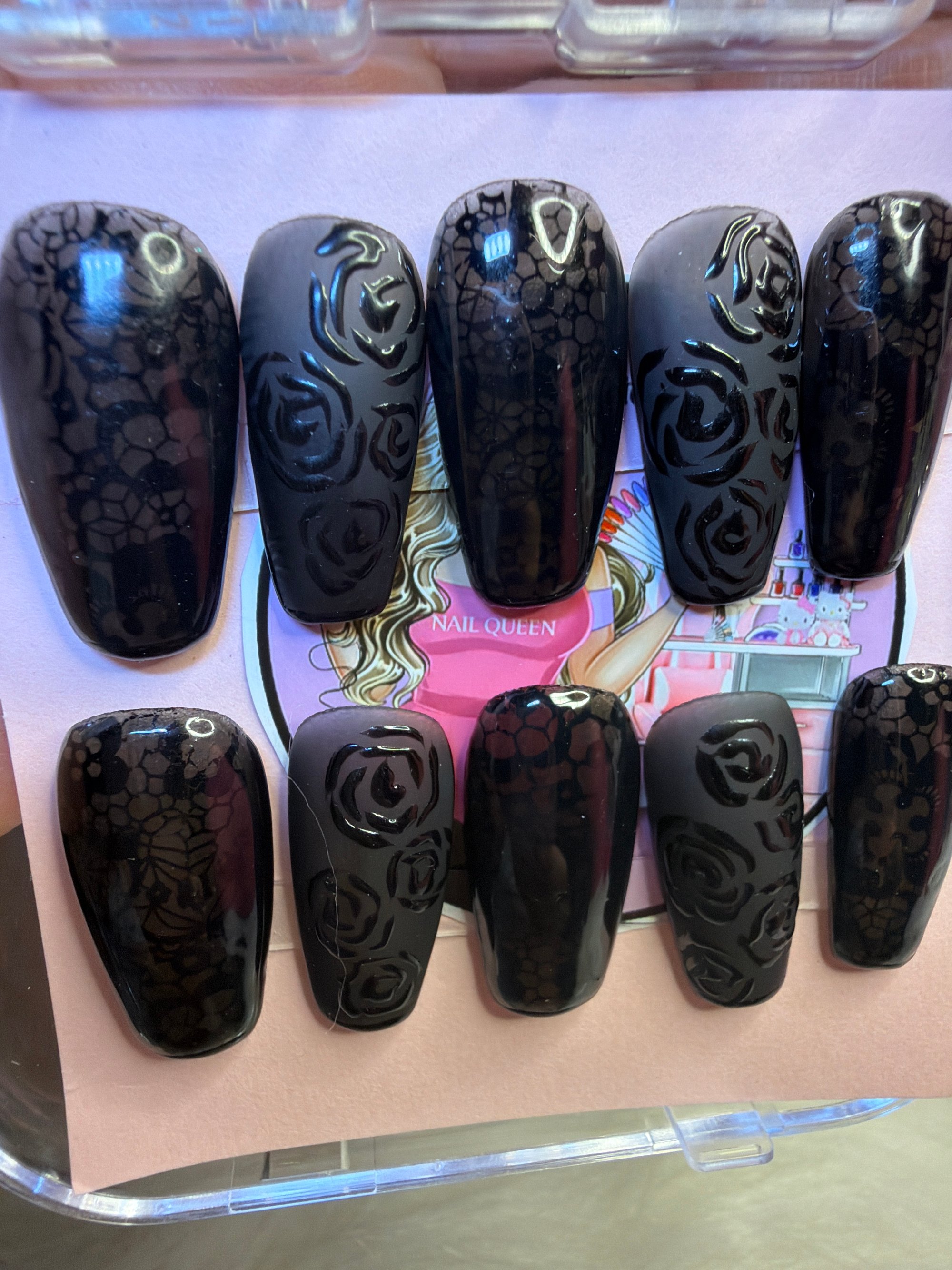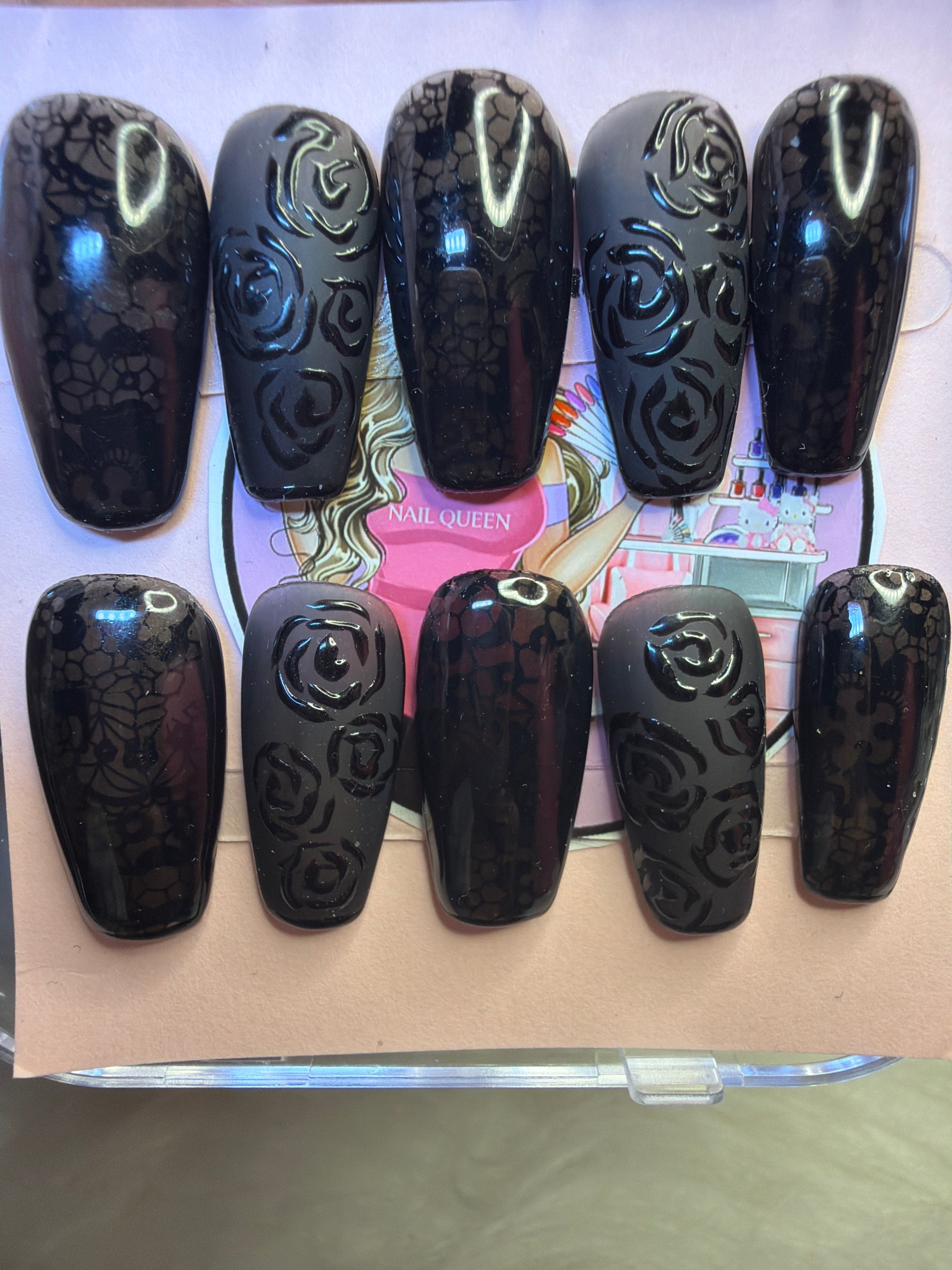 Acrylic Strong sturdy press on nails in a coffin MEDIUM STANDARD SIZE .. Length is also medium . Design is hand painted roses with accent blk lace in a glossy tone .. Nails are Long lasting REUSABLE