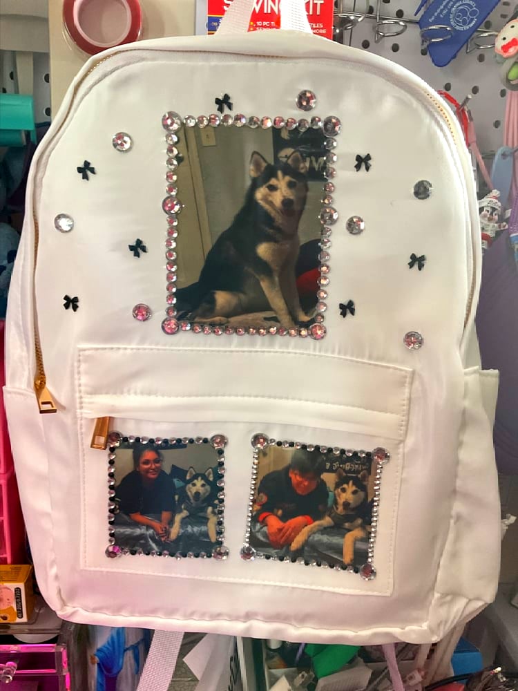 COME CUSTOMIZE YOUR BACK PACK WITH ANY PERSONAL PRINT OR LOGO ADD RHINESTONES ANY COLOR TO IT (extra) just press botton below and in notes plz put colors of rhinestones desired .. BACK PACK IS MEDIUM SIZE CAN FIT LAP TOP AND SEVERAL ITEMS HAS 2 pockets on each side zipper pocket in front for pens cell or any small items has main big zipper and on inside of back pack another small zipper pocket .. Has big thick padded straps so NO digging straps on back .. BACK PACK MEASUREMENTS ARE WIDE 12β by 16 β length .. All orders come with free gift π