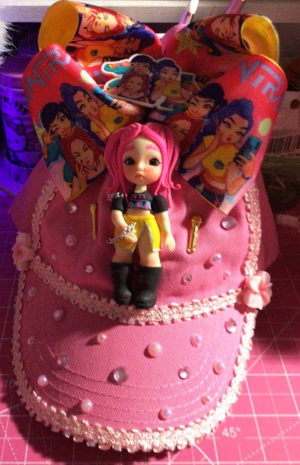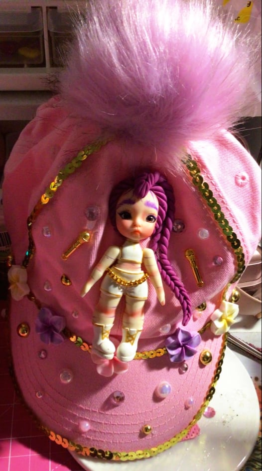 KIDS HATS π§’ with handmade sculpted clay porcelain k pop demon hunter dolls with gold color microphones on each side blinged out accessories all over hat