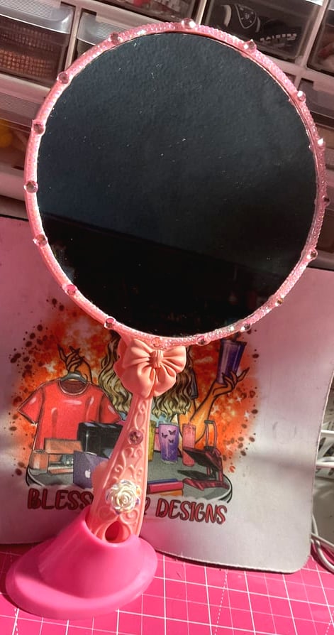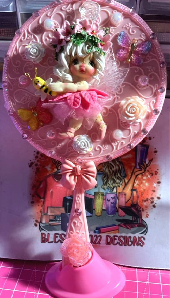 Adorable handmade Decor mirror with a handmade sculpted porcelain clay fairy ballerina doll with lots of rhinestones and flowers and hand sculpted clay bows .Mirror is decorated on both sides