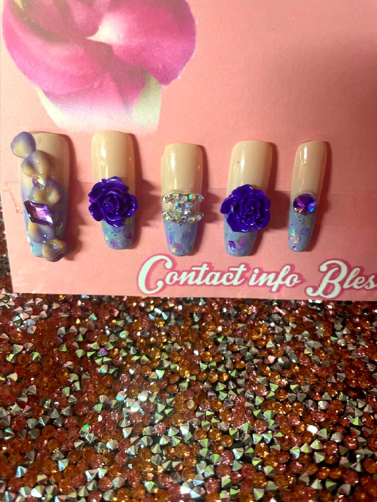 Medium General standard size set .. Lavender and natural nude color 2 tone with sprinkle cute glitter and acrlic falling pedals in thumbs with purple rhinestone.. Chanel rhinestone charm on middle finger and purple rose on pointer and ring finger also with 1 rhinestone puple rhinestone on pinky .. This set is reusable made with acrylic .. All sets come with accessory bag with all you need for application