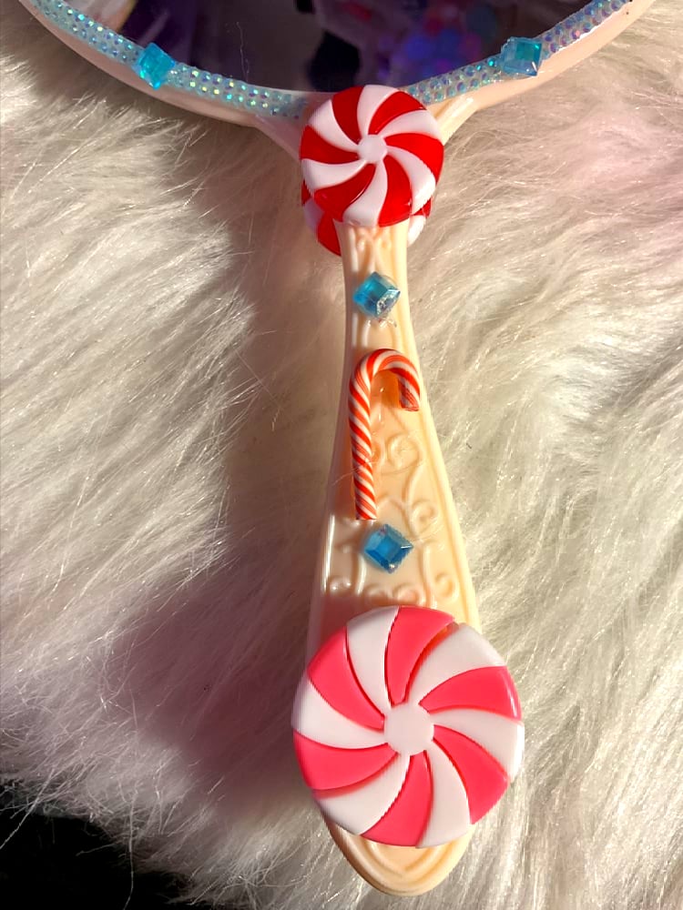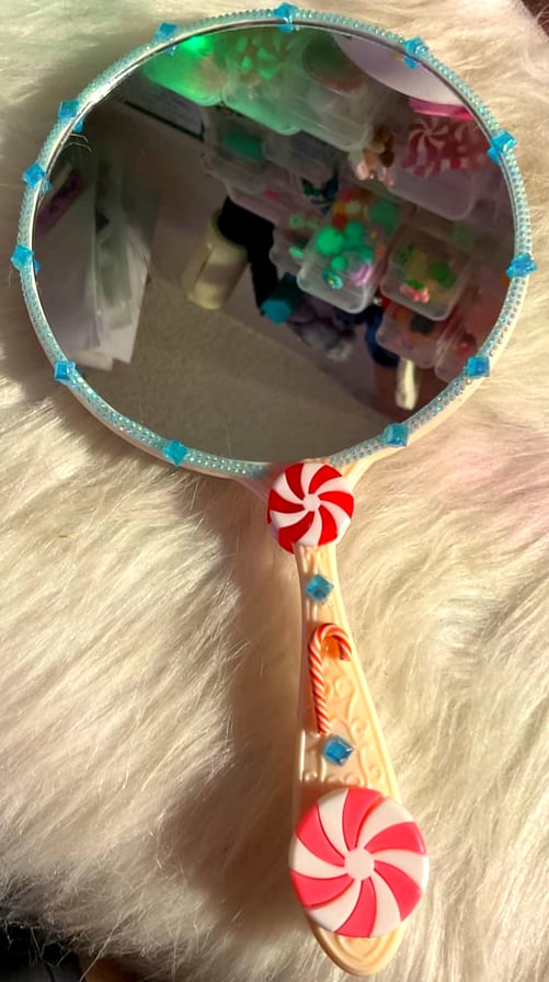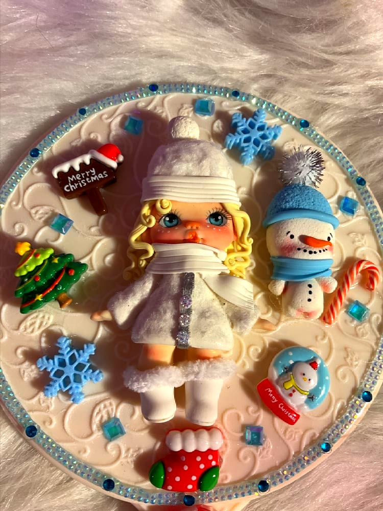 Hand made decorated adorable mirror with handmade clay if a snow girl with her handmade snow man with rhinestones and cute Christmas theme resin ornaments on both sides of mirror