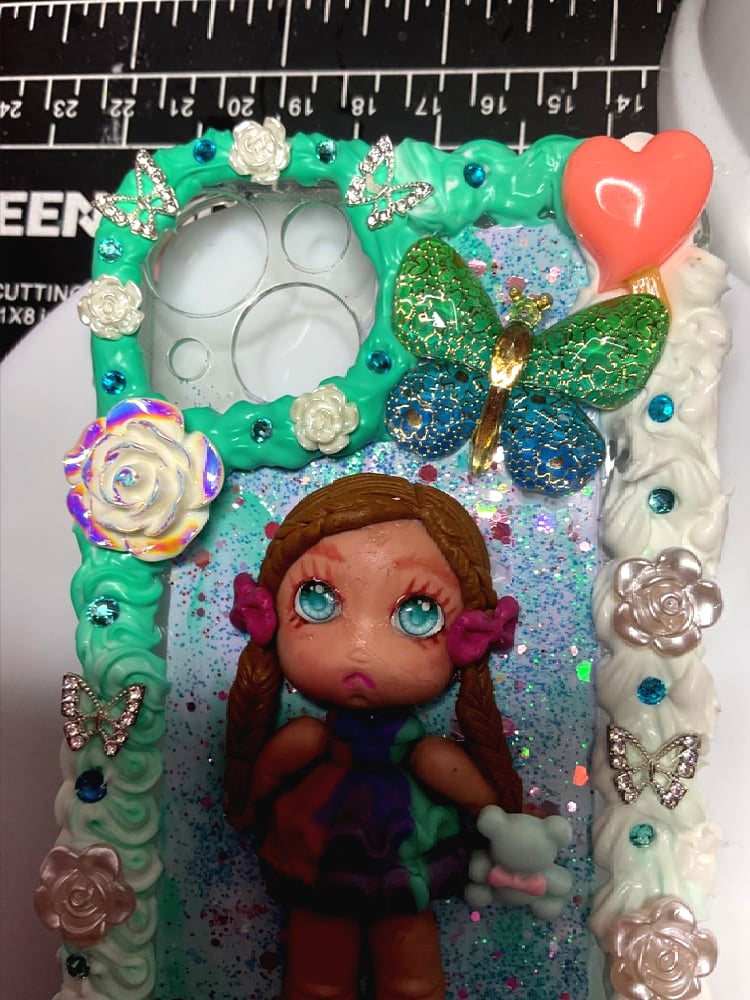 Adorable iphone case fits 13/14/15 .. handmade baby doll made out of clay with rose charm flowers and rhinestone butterfly’s . Colors teal white bby blue